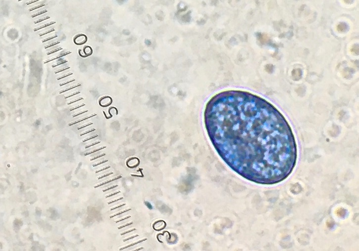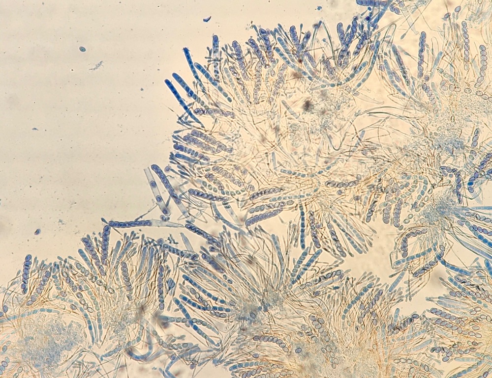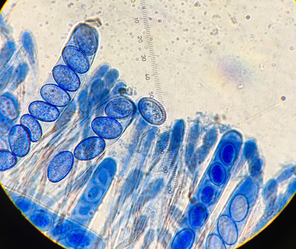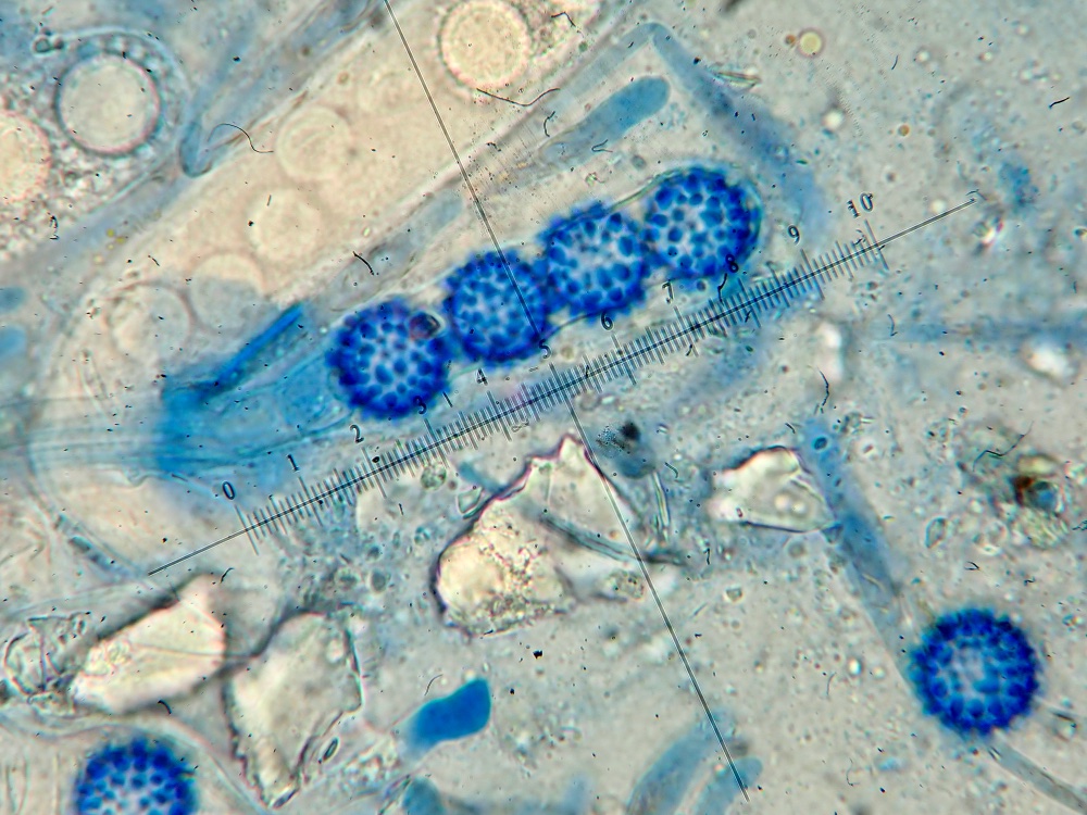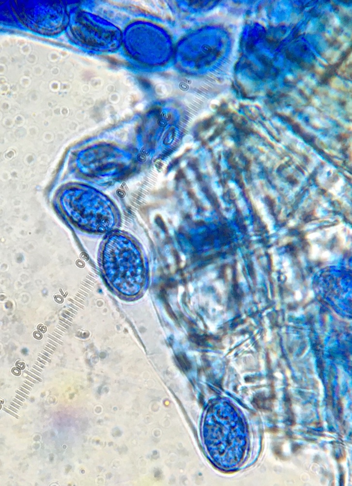 Die Sporen sind ellipsoid und messen 17 x 10-12, die Enden sind abgerundet. Für mich ist das Ornament schwer beurteilbar, ich würde sagen, es sind niedrige Grate und Warzen. Ich habe einige Fotos gemacht, um eine Beurteilung zu ermöglichen. Der Sporenquotient beträgt 1,57.