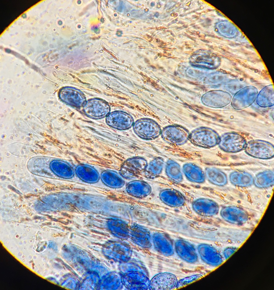 bei den Scutellinien halte ich mich immer noch gern an die Rasterbilder von Schumacher. Tendenziell hat S. crinita die "runderen" Sporen, am Ende rascher abgeflacht, und S. scutellata die "konischer zuspitzenden". Die Sporen würde ich den runderen zuordnen. Das Ornament kann man genauer sehen, wenn man die Blende weiter aufmacht und dann auf die Sporenoberfläche scharf stellt, dann ist zwar der Umriss unscharf, aber man sieht die Ornamentierung besser. Leider scheinen erst wenige wirklich reif zu sein, da viele noch in den Asci drinnen sind.