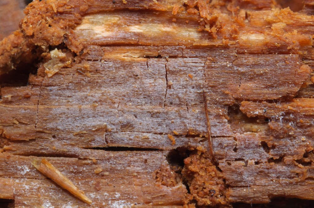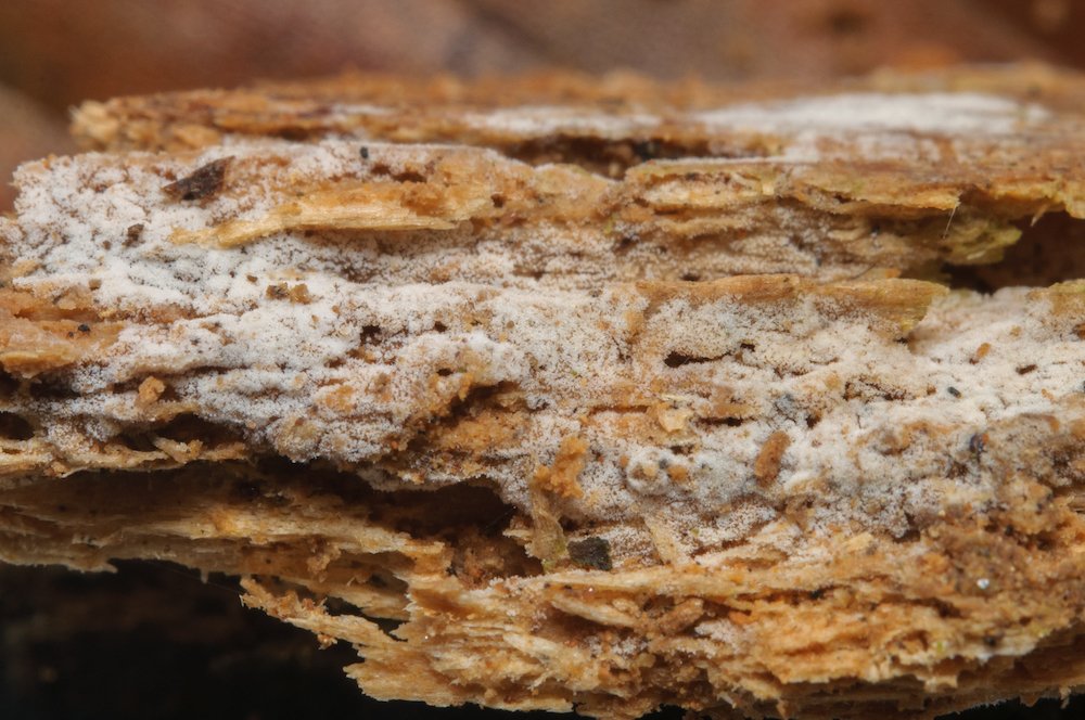 Tubulicrinis strangulatus: Unterseite eines braunfaulen Nadelholz-Stücks.