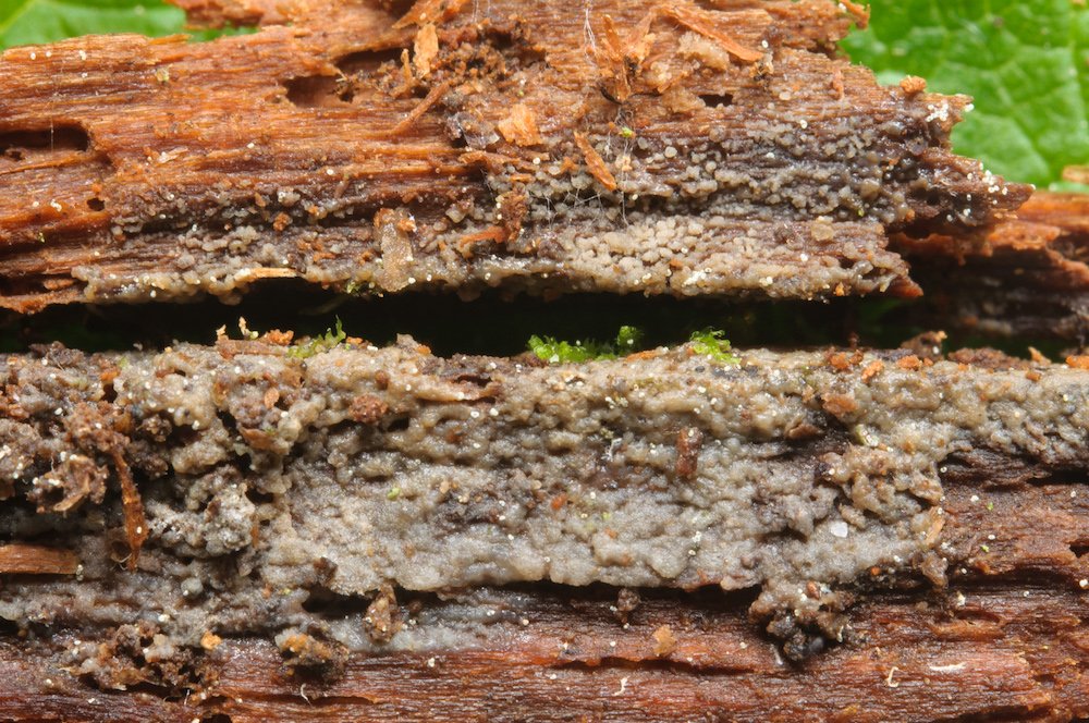 Paullicorticium ansatum: Liegender, morscher Nadelholz-Stamm.